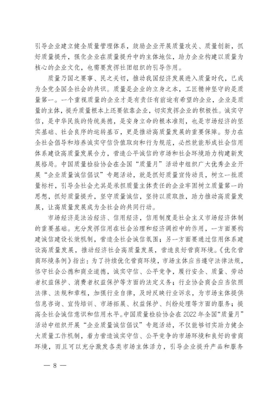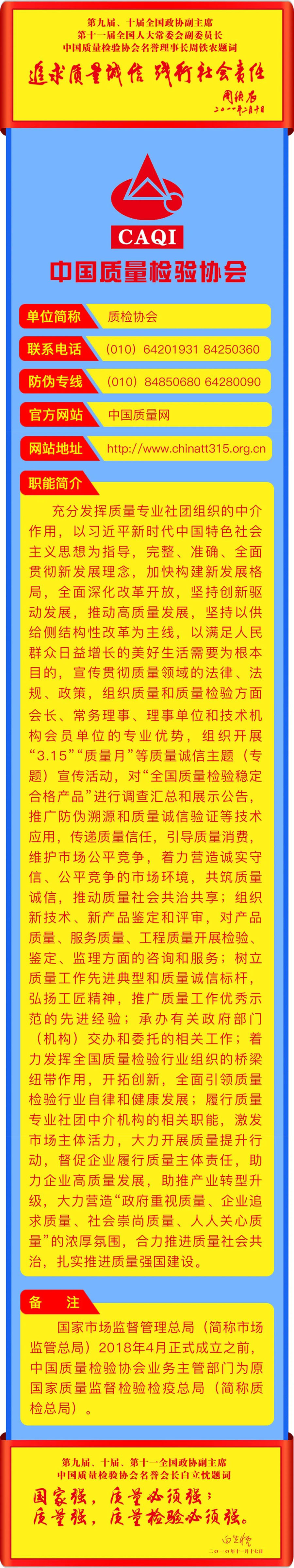 李克強(qiáng)總理批示指出,打造集質(zhì)量、標(biāo)準(zhǔn)、技術(shù)、品牌等于一體的高品質(zhì)產(chǎn)品和服務(wù),在市場(chǎng)競(jìng)爭(zhēng)中鍛就中國(guó)質(zhì)量、培育中國(guó)精品。倡導(dǎo)企業(yè)對(duì)產(chǎn)品和服務(wù)質(zhì)量作出誠(chéng)信倡議,也是中國(guó)質(zhì)量檢驗(yàn)協(xié)會(huì)自2004年以來(lái)組織開(kāi)展全國(guó)“質(zhì)量月”企業(yè)質(zhì)量誠(chéng)信倡議專(zhuān)題活動(dòng)的要義。謹(jǐn)期社會(huì)各界共同努力,推進(jìn)質(zhì)量社會(huì)共治,抓好產(chǎn)品和服務(wù)的高品質(zhì)質(zhì)量提升,共同為我們的質(zhì)量強(qiáng)國(guó)事業(yè)去奮斗!