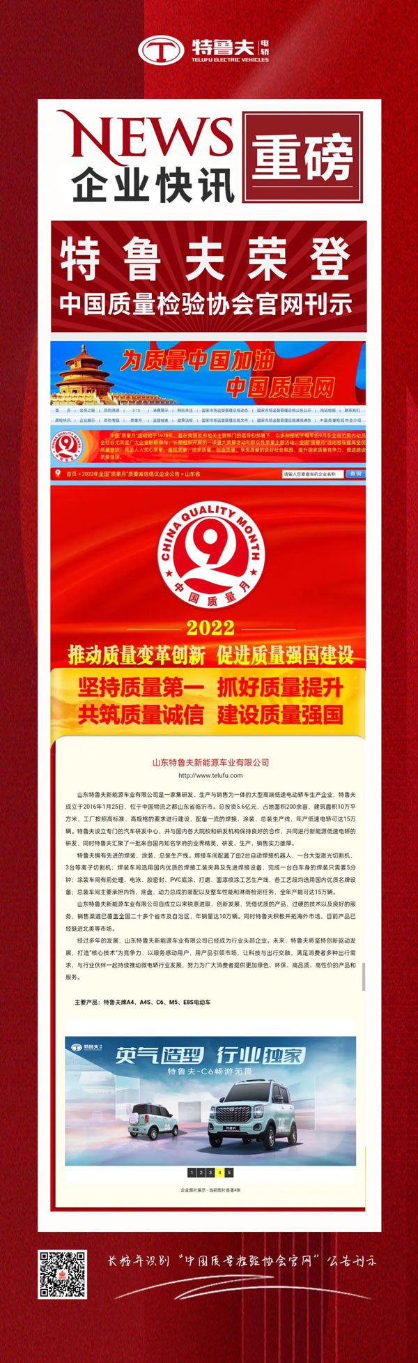 在經(jīng)過企業(yè)申報(bào)、質(zhì)量誠信調(diào)查、社會評價(jià)、專家評審等多個(gè)環(huán)節(jié)層層考核后,特魯夫順利通過此批次多項(xiàng)證書認(rèn)證審核,“榮獲全國新能源電轎行業(yè)質(zhì)量領(lǐng)先品牌”、“全國新能源電轎行業(yè)質(zhì)量領(lǐng)先企業(yè)”、“全國質(zhì)量檢驗(yàn)誠信企業(yè)”、“全國產(chǎn)品和服務(wù)質(zhì)量誠信品牌”、“全國質(zhì)量檢驗(yàn)穩(wěn)定合格產(chǎn)品”五大榮譽(yù)證書。