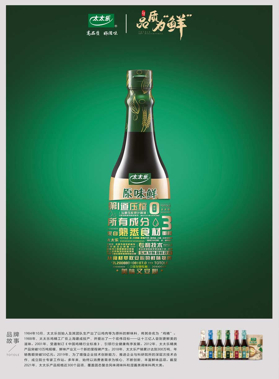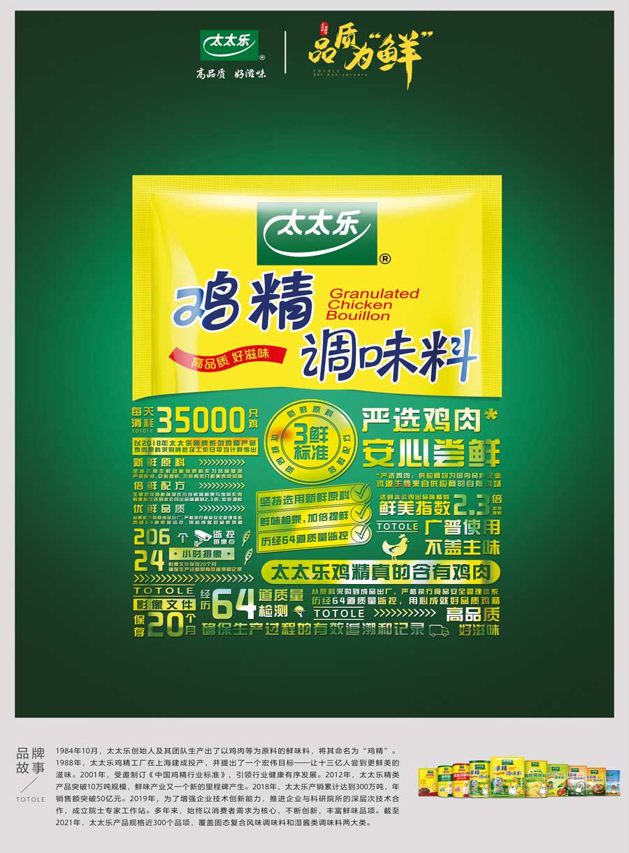 上海太太樂食品有限公司創(chuàng)立于1988年,中國雞精、雞粉行業(yè)標準制定單位之一,并于1999年加入世界知名的食品飲料公司瑞士雀巢,充分利用國際資源加速產品和技術研發(fā)。秉承“太太樂,讓生活更美好”的企業(yè)愿景,太太樂一直致力于鮮味科學的研究和推廣,帶動鮮味產業(yè)的技術創(chuàng)新,不斷為消費者帶來健康又美味的新一代調味品。