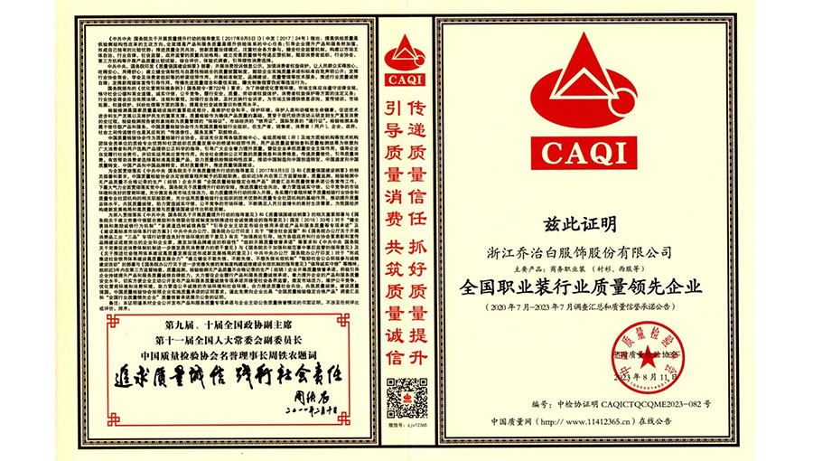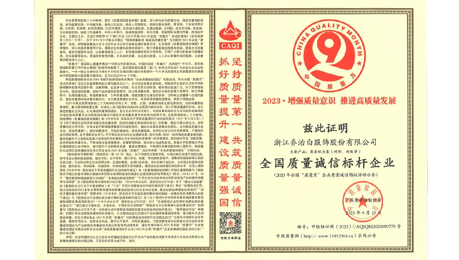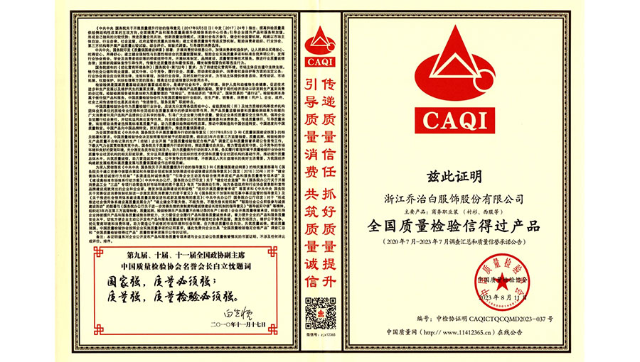 喬治白先后榮獲中國名牌產(chǎn)品、中國職業(yè)裝十大領軍企業(yè)、全國守合同重信用單位、國家級綠色工廠、浙江省智能工廠等榮譽稱號。作為全國標準化工作先進單位,喬治白積極參與標準化工作,先后參與《職業(yè)裝檢驗規(guī)則》、《襯衫》、《女西服、大衣》等9項國家標準的起草與修訂工作,《全毛襯西服》行業(yè)標準起草。