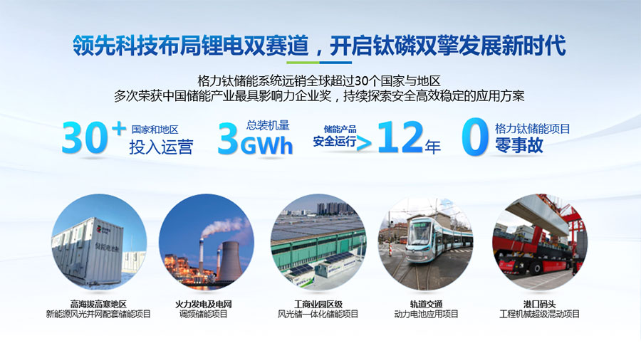 以完善的研發(fā)體系,公司加快技術創(chuàng)新與產(chǎn)業(yè)升級的步伐。公司研發(fā)的格力鈦電池安全性長期領跑行業(yè),憑借具有高安全、大倍率、快充放、耐寬溫、長壽命等特性,被選為“國家制造業(yè)單項冠軍產(chǎn)品”,廣泛應用于新能源汽車以及工商業(yè)園區(qū)、通訊基站、電網(wǎng)調頻、軌道交通、風光消納、船舶岸電、家庭住宅、軍事科研等儲能領域,具有廣闊的市場前景和應用價值。目前,格力鈦儲能產(chǎn)品已在丹麥、瑞士、芬蘭等全球30多個國家和地區(qū)使用,新能源汽車產(chǎn)品在北京、杭州、武漢、成都、青島、哈爾濱、包頭、??诘热?40多座城市運營,12年全球零電池事故安全運行。