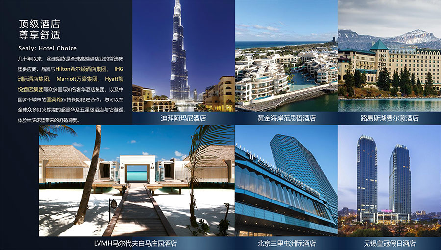 幾十年以來(lái),絲漣始終是全球高端酒店業(yè)的首選床墊供應(yīng)商。品牌與Hilton希爾頓酒店集團(tuán)、IHG洲際酒店集團(tuán)、Marriott萬(wàn)豪集團(tuán)、Hyatt凱悅酒店集團(tuán)等眾多國(guó)際知名奢華酒店集團(tuán),以及中國(guó)多個(gè)城市的國(guó)賓館保持長(zhǎng)期穩(wěn)定合作。您可以在全球眾多燈火輝煌的超豪華及五星級(jí)酒店與它邂逅,體驗(yàn)絲漣床墊帶來(lái)的舒適尊貴。