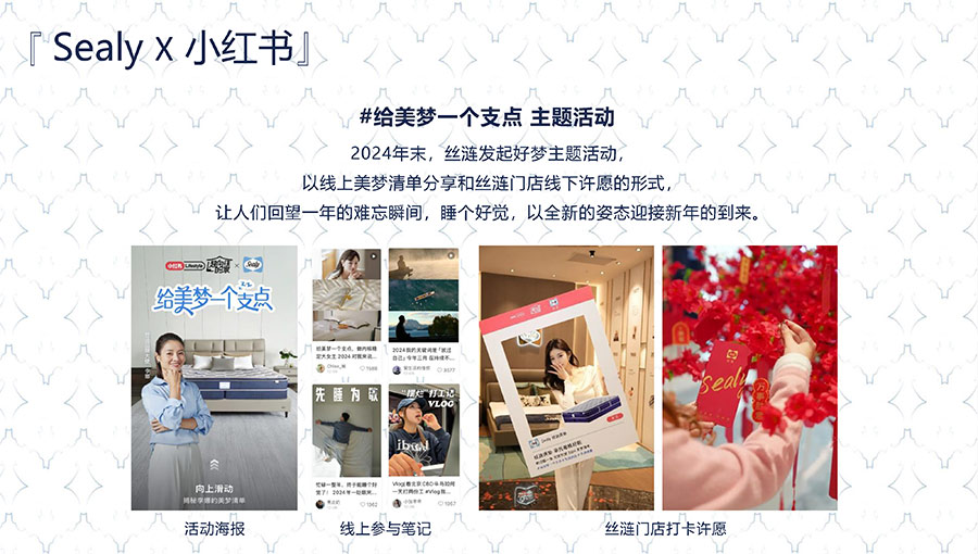 2024年末,絲漣發(fā)起好夢(mèng)主題活動(dòng),以線上美夢(mèng)清單分享和絲漣門店線下許愿的形式,讓人們回望一年的難忘瞬間,睡個(gè)好覺(jué),以全新的姿態(tài)迎接新年的到來(lái)。