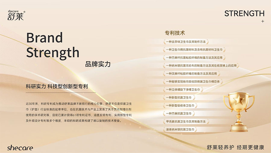 舒萊作為抑菌衛(wèi)生巾行業(yè)標(biāo)準(zhǔn)起草單位,目前累計擁有61項國家專利(含發(fā)明專利、實用新型及外觀專利),也在抗菌技術(shù)與產(chǎn)業(yè)上發(fā)表了關(guān)于熒光劑增白劑使用的學(xué)術(shù)研究等,構(gòu)建了難以復(fù)制的技術(shù)壁壘。