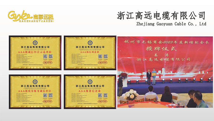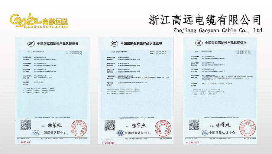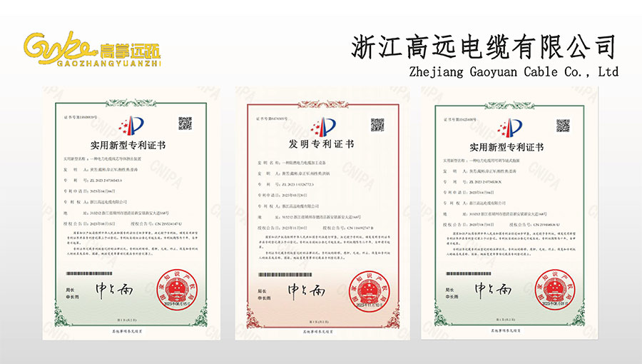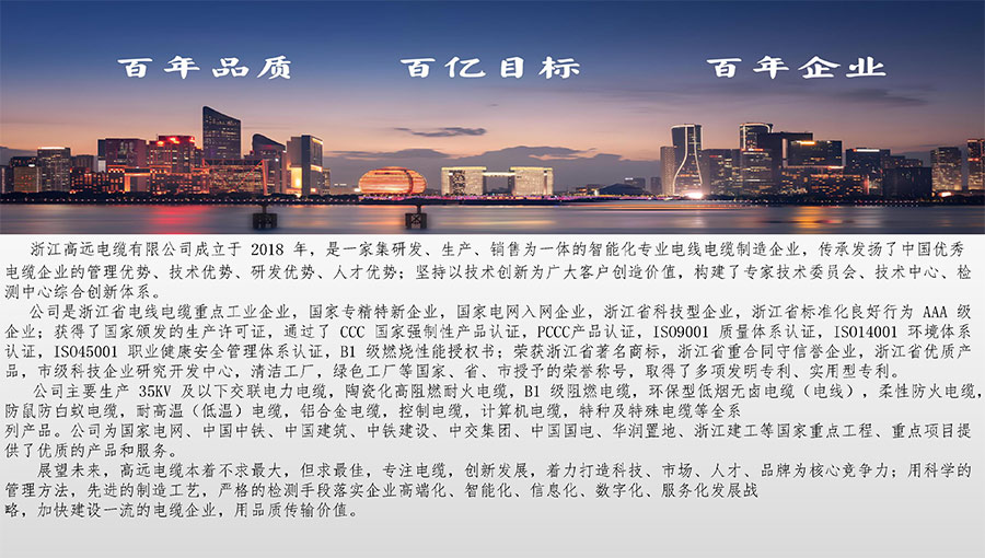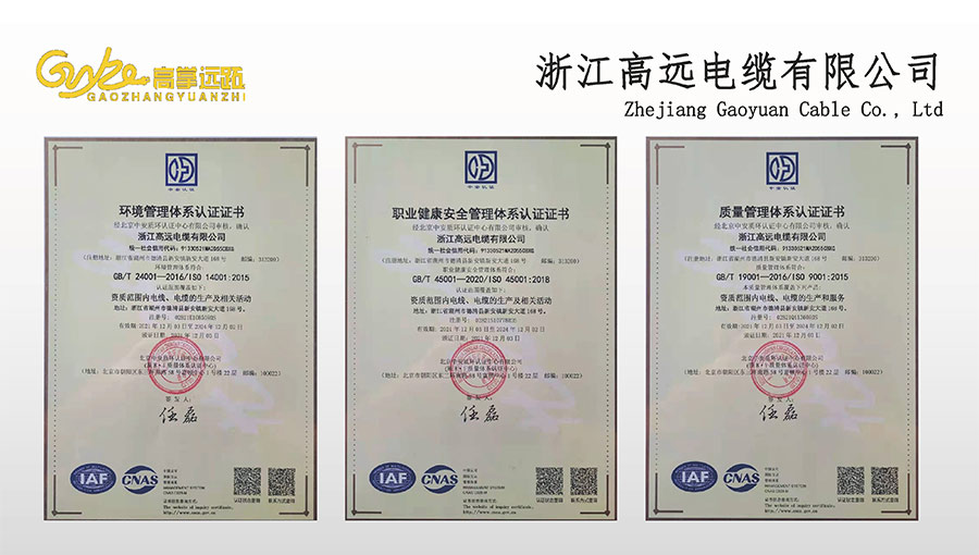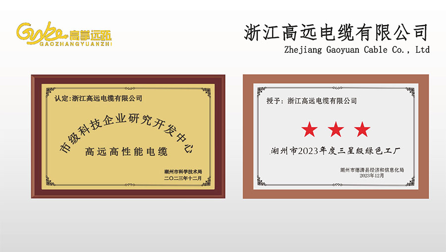 高遠(yuǎn)電纜是浙江省電線電纜重點工業(yè)企業(yè),浙江省專精特新企業(yè)、浙江省科技型企業(yè),浙江省標(biāo)準(zhǔn)化良好行為AAA級企業(yè);獲得了國家頒發(fā)的生產(chǎn)許可證,通過了CCC國家強(qiáng)制性產(chǎn)品認(rèn)證,ISO9001質(zhì)量體系認(rèn)證,ISO14001環(huán)境體系認(rèn)證,OHSAS18001職業(yè)健康安全管理體系認(rèn)證,PCCC產(chǎn)品認(rèn)證、B1級燃燒性能授權(quán)書;榮獲浙江省著名商標(biāo),浙江省重合同守信譽企業(yè),浙江省優(yōu)質(zhì)產(chǎn)品,市級研究開發(fā)中心,清潔工廠,綠色工廠等國家、省、市授權(quán)的榮譽稱號,取得了多項發(fā)明專利、實用型專利。