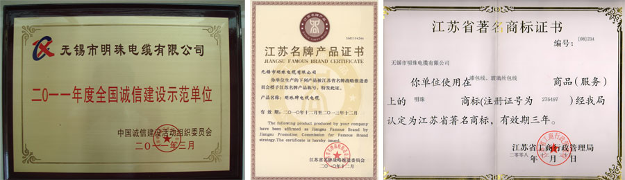明珠電纜公司先后通過了ISO9001質(zhì)量管理體系認證,ISO14001環(huán)境管理體系認證,OHSAS18001職業(yè)健康安全管理體系認證,國家強制性產(chǎn)品認證(3C認證),PCCC認證,煤安MA認證和全國工業(yè)產(chǎn)品生產(chǎn)許可證等認證。“明珠”以優(yōu)質(zhì)品牌形象和優(yōu)秀的企業(yè)文化著稱于行業(yè)。“明珠牌”電線電纜產(chǎn)品先后被認定為“全國用戶滿意產(chǎn)品”、“高新技術產(chǎn)品”、“江蘇省名牌產(chǎn)品”、“江蘇省用戶滿意產(chǎn)品”、“江蘇省市場抽檢合格產(chǎn)品”、“無錫市重點保護產(chǎn)品”等;“明珠”商標被評為“江蘇省著名商標”;明珠電纜公司先后榮獲“全國用戶滿意企業(yè)”、“全國重合同守信用企業(yè)”、“資信等級AAA企業(yè)”、“產(chǎn)品質(zhì)量信得過企業(yè)”等榮譽稱號。