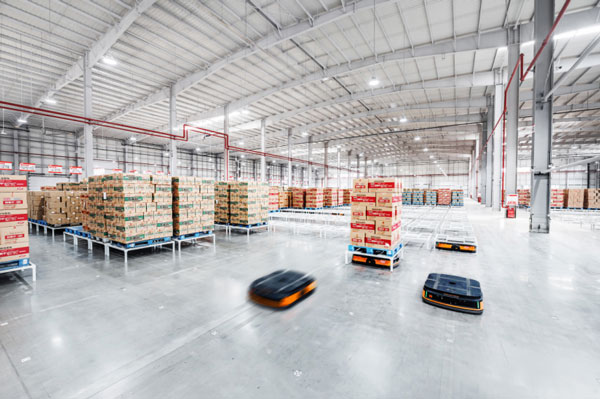 衛(wèi)龍倉庫內,智能AGV小車正在快速將產(chǎn)品搬運到指定位置。