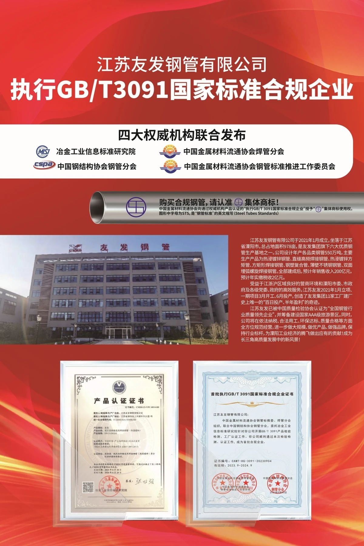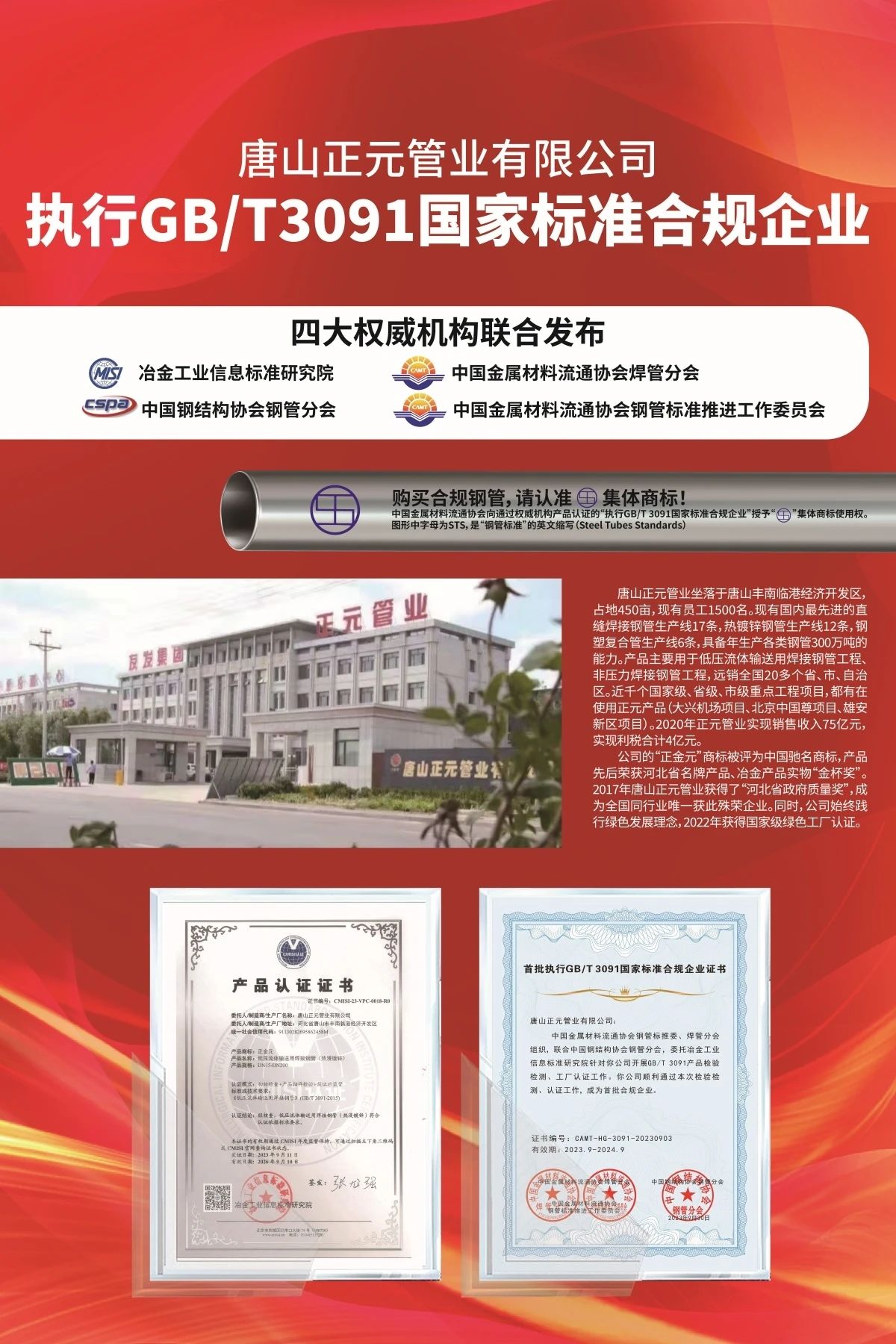 10月16日,由四大權威機構聯(lián)合發(fā)布的首批入圍《執(zhí)行GB/T 3091國家標準合規(guī)企業(yè)名錄》的14家企業(yè)中,有5家為友發(fā)集團旗下企業(yè)。分別為友發(fā)集團第一分公司、唐山正元管業(yè)、邯鄲友發(fā)、陜西友發(fā)和江蘇友發(fā),涵蓋友發(fā)集團全部鍍鋅圓管產(chǎn)品。