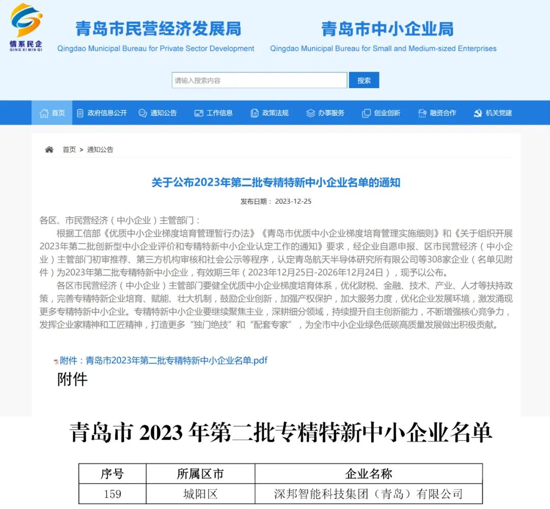 12月25日,青島市民營經(jīng)濟發(fā)展局發(fā)布了《關于公示2023年第二批專精特新中小企業(yè)名單的通知》,深邦集團憑借卓越的創(chuàng)新技術、完善的產(chǎn)品體系、高效的運營模式以及穩(wěn)健的經(jīng)營實力順利通過層層審核,獲評2023年第二批“專精特新”中小企業(yè)。