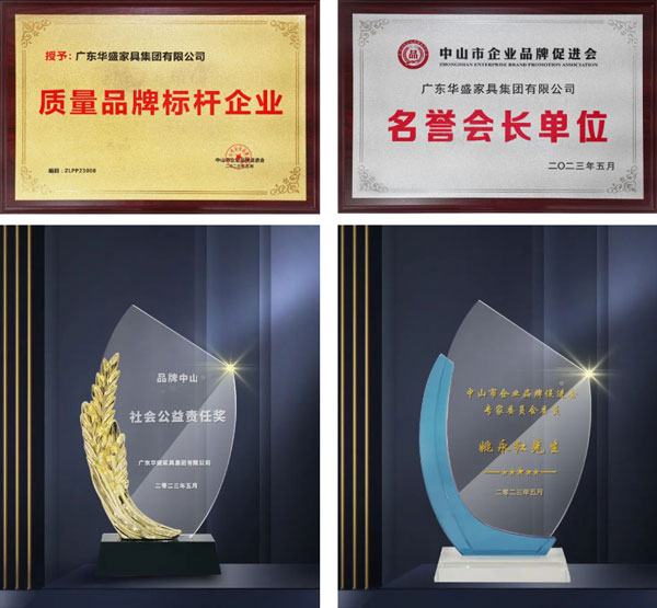 華盛家具集團憑借卓越的品牌實力獲頒“質(zhì)量品牌標(biāo)桿企業(yè)”、“品牌中山社會公益責(zé)任獎”、“名譽會長單位”榮譽稱號,同時,姚永紅董事長獲聘“中山市企業(yè)品牌促進會專家委員會委員”。