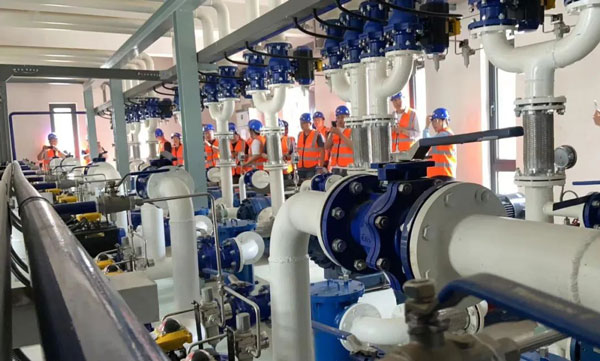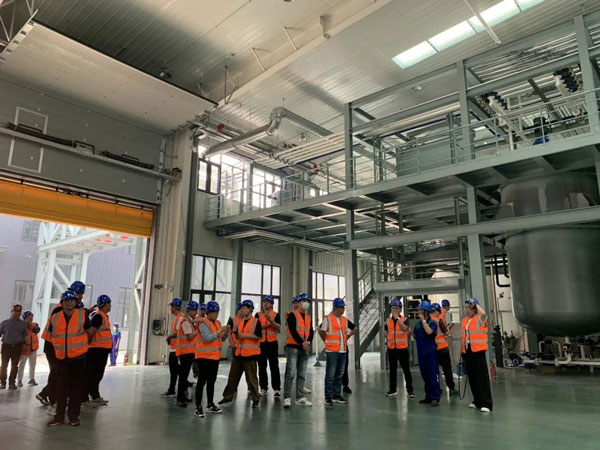 在李艷國董事長、生產(chǎn)部經(jīng)理王建成等領(lǐng)導的陪同下,商學院觀摩團先后參觀了新廠的基礎(chǔ)油儲罐區(qū)、實驗中心、潤滑油調(diào)和設(shè)備及灌裝生產(chǎn)線、潤滑脂調(diào)和設(shè)備、金屬加工油液/防凍液/尿素溶液的生產(chǎn)工藝及設(shè)備。