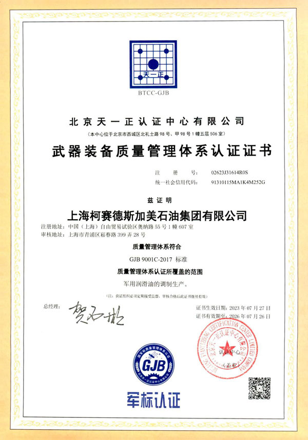 日前,上海柯賽德斯加美石油集團(tuán)有限公司在質(zhì)量管理、生產(chǎn)制程和技術(shù)創(chuàng)新方面再上新臺階,實現(xiàn)質(zhì)量管理體系認(rèn)證的重大突破,取得“武器裝備質(zhì)量管理體系認(rèn)證”證書。