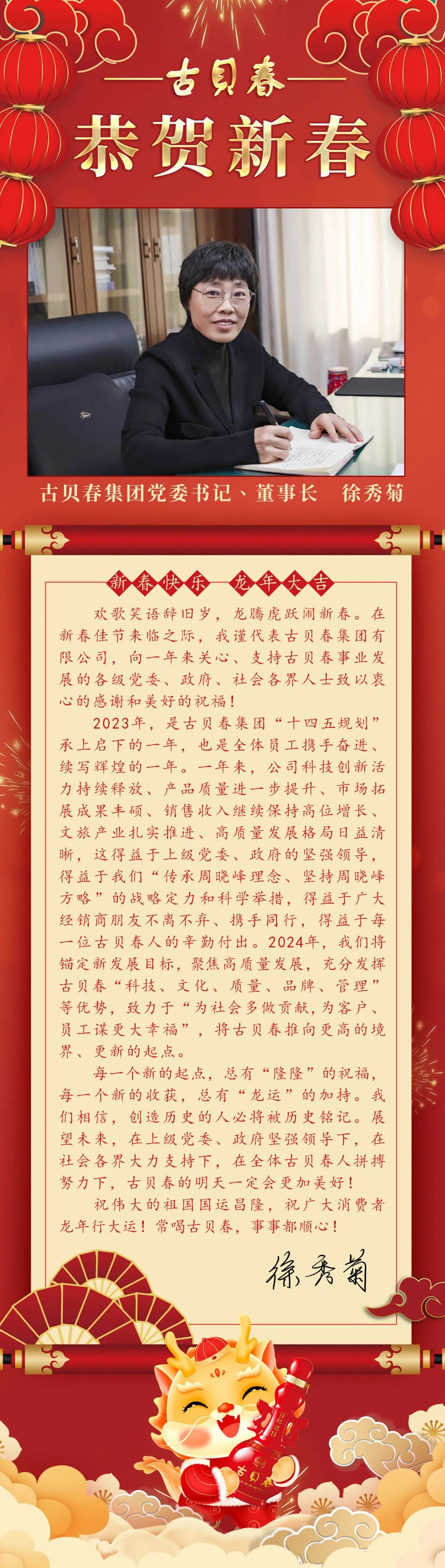 古貝春集團(tuán)有限公司黨委書記、董事長(zhǎng)徐秀菊攜全體員工恭祝全國(guó)人民新春快樂(lè)!