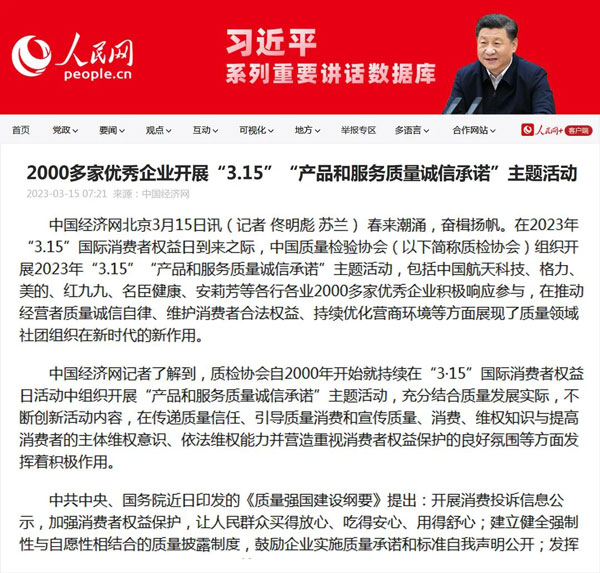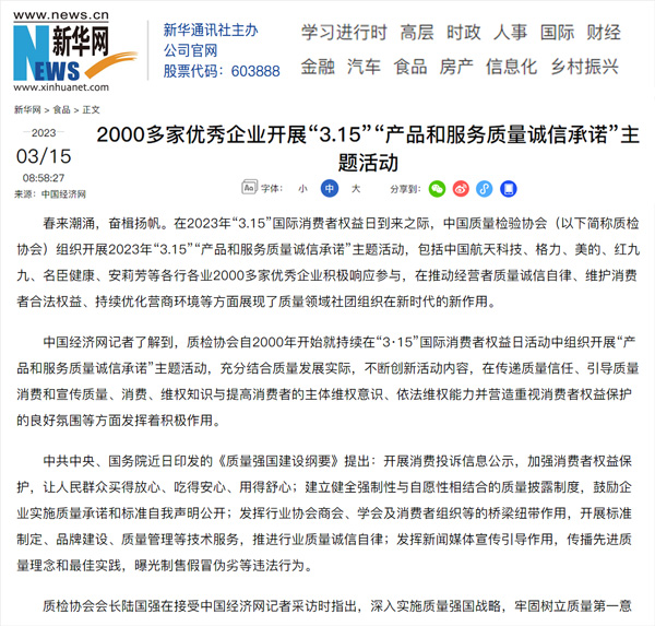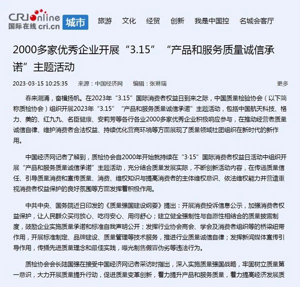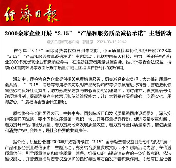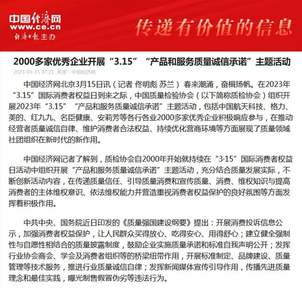 ——中國質量檢驗協(xié)會組織2000多家優(yōu)秀典范企業(yè)開展“3.15”產品和服務質量誠信承諾活動