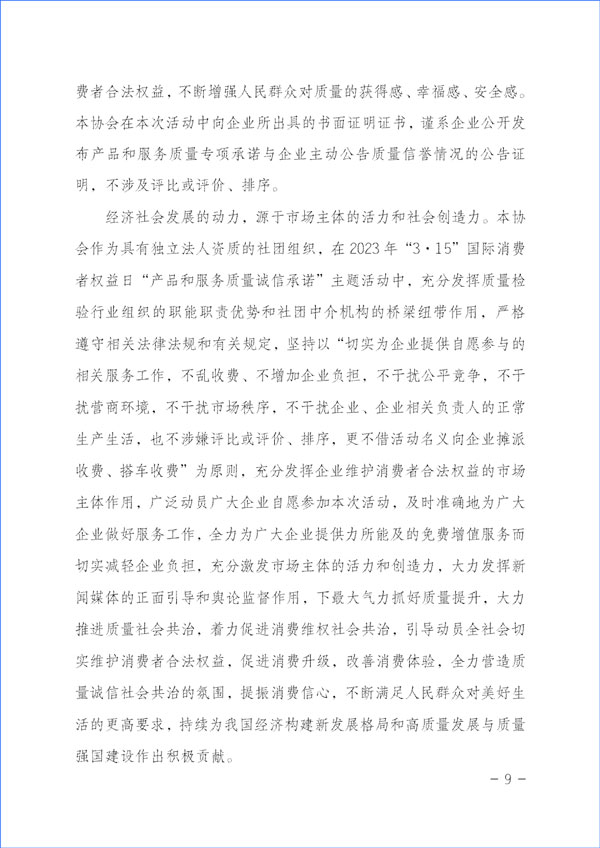 經(jīng)濟社會發(fā)展的動力,源于市場主體的活力和社會創(chuàng)造力。本協(xié)會作為具有獨立法人資質的社團組織,在2023年“3·15”國際消費者權益日“產品和服務質量誠信承諾”主題活動中,充分發(fā)揮質量檢驗行業(yè)組織的職能職責優(yōu)勢和社團中介機構的橋梁紐帶作用,嚴格遵守相關法律法規(guī)和有關規(guī)定,堅持以“切實為企業(yè)提供自愿參與的相關服務工作,不亂收費、不增加企業(yè)負擔,不干擾公平競爭,不干擾營商環(huán)境,不干擾市場秩序,不干擾企業(yè)、企業(yè)相關負責人的正常生產生活,也不涉嫌評比或評價、排序,更不借活動名義向企業(yè)攤派收費、搭車收費”為原則,充分發(fā)揮企業(yè)維護消費者合法權益的市場主體作用,廣泛動員廣大企業(yè)自愿參加本次活動,及時準確地為廣大企業(yè)做好服務工作,全力為廣大企業(yè)提供力所能及的免費增值服務而切實減輕企業(yè)負擔,充分激發(fā)市場主體的活力和創(chuàng)造力,大力發(fā)揮新聞媒體的正面引導和輿論監(jiān)督作用,下最大氣力抓好質量提升,大力推進質量社會共治,著力促進消費維權社會共治,引導動員全社會切實維護消費者合法權益,促進消費升級,改善消費體驗,全力營造質量誠信社會共治的氛圍,提振消費信心,不斷滿足人民群眾對美好生活的更高要求,持續(xù)為我國經(jīng)濟構建新發(fā)展格局和高質量發(fā)展與質量強國建設作出積極貢獻。
