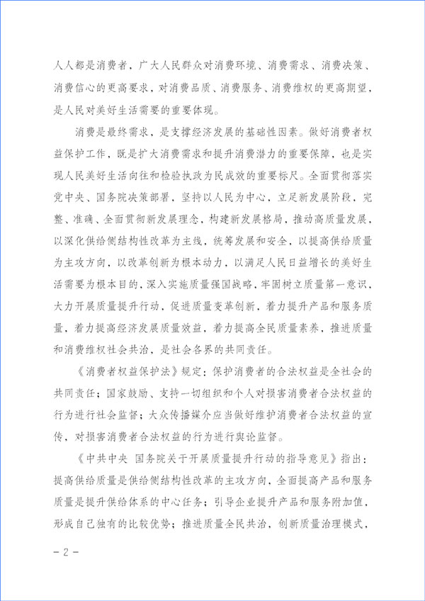 消費是最終需求,是支撐經(jīng)濟發(fā)展的基礎性因素。做好消費者權益保護工作,既是擴大消費需求和提升消費潛力的重要保障,也是實現(xiàn)人民美好生活向往和檢驗執(zhí)政為民成效的重要標尺。全面貫徹落實黨中央、國務院決策部署,堅持以人民為中心,立足新發(fā)展階段,完整、準確、全面貫徹新發(fā)展理念,構建新發(fā)展格局,推動高質量發(fā)展,以深化供給側結構性改革為主線,統(tǒng)籌發(fā)展和安全,以提高供給質量為主攻方向,以改革創(chuàng)新為根本動力,以滿足人民日益增長的美好生活需要為根本目的,深入實施質量強國戰(zhàn)略,牢固樹立質量第一意識,大力開展質量提升行動,促進質量變革創(chuàng)新,著力提升產品和服務質量,著力提高經(jīng)濟發(fā)展質量效益,著力提高全民質量素養(yǎng),推進質量和消費維權社會共治,是社會各界的共同責任。