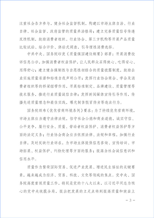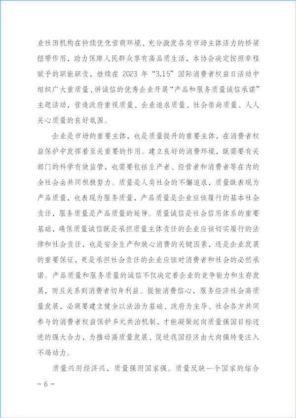 質量是人類生產生活的重要保障。為努力開創(chuàng)質量專業(yè)社團組織在新時代的新作用,大力推動經(jīng)營者質量誠信自律,切實維護消費者合法權益,積極督促企業(yè)承諾產品和服務質量主體責任,強化引領企業(yè)履行產品和服務質量誠信承諾,切實營造公平競爭的市場環(huán)境和安全放心的消費環(huán)境,進一步充分發(fā)揮質量檢驗行業(yè)社團組織和質量專業(yè)社團機構在持續(xù)優(yōu)化營商環(huán)境、充分激發(fā)各類市場主體活力的橋梁紐帶作用,助力保障人民群眾享有高品質生活,本協(xié)會決定按照章程賦予的職能職責,繼續(xù)在2023年“3·15”國際消費者權益日活動中組織廣大重質量、講誠信的優(yōu)秀企業(yè)開展“產品和服務質量誠信承諾”主題活動,營造政府重視質量、企業(yè)追求質量、社會崇尚質量、人人關心質量的良好氛圍。