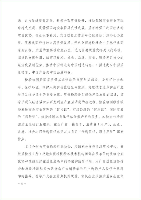 檢驗檢測是國家質量基礎設施的重要組成部分,是維護社會和平、保護環(huán)境、保護人類和動植物生命健康、促進技術進步和生產發(fā)展以及維護民生的重要支撐。質量檢驗作為確保產品質量的基礎,貫穿于現(xiàn)代經(jīng)濟活動從研發(fā)到生產直至消費的全過程,檢驗檢測報告被形象地稱為質量管理的“體檢證”、市場經(jīng)濟的“信用證”、國際貿易的“通行證”。檢驗檢測本身屬于信任型產品和服務,本協(xié)會作為我國質量檢驗行業(yè)組織,在生產者、銷售者、消費者(用戶)、企業(yè)、政府、社會之間傳遞信任也是其應有的“傳遞信任,服務發(fā)展”職能特點。