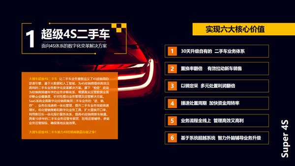 多年來,268V檢測系統(tǒng)已經(jīng)在全國經(jīng)銷商中普及,累計檢測數(shù)百萬車輛。如今,該系統(tǒng)進(jìn)一步融入云計算、人工智能、圖像識別、語音識別等先進(jìn)技術(shù),可以實(shí)現(xiàn)全程無人化和更高的檢測效率與精準(zhǔn)度。在此基礎(chǔ)上,車易拍聚合大搜車的SaaS能力和自身的交易拍賣能力,推出了超級4S二手車這一數(shù)字化變革解決方案,通過對進(jìn)、銷、存、管的全面數(shù)字化,有效推動經(jīng)銷商內(nèi)部工作流程的規(guī)范化和提升運(yùn)營效率。