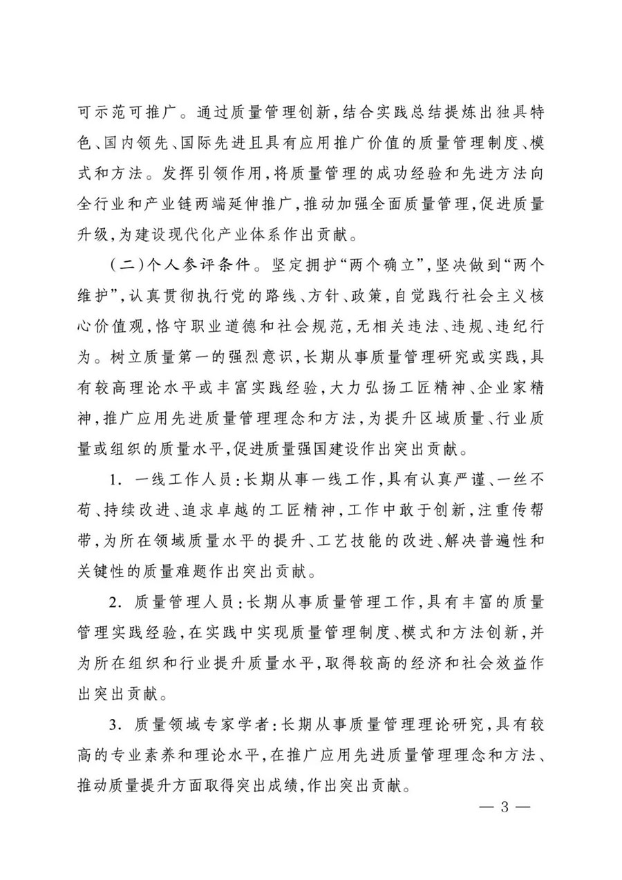3. 質(zhì)量領(lǐng)域?qū)<覍W(xué)者:長期從事質(zhì)量管理理論研究,具有較高的專業(yè)素養(yǎng)和理論水平,在推廣應(yīng)用先進(jìn)質(zhì)量管理理念和方法、推動(dòng)質(zhì)量提升方面取得突出成績,作出突出貢獻(xiàn)。