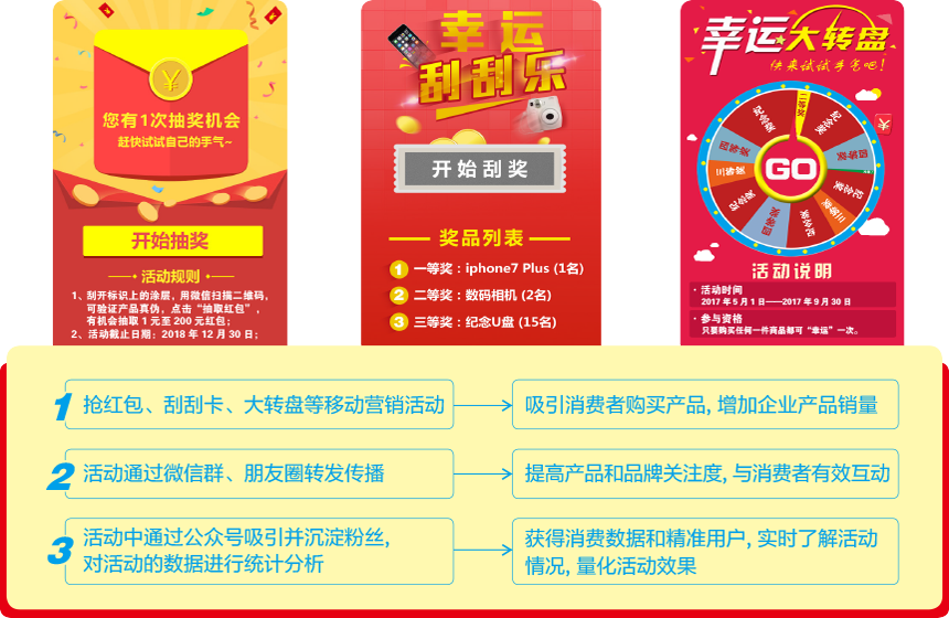 消費(fèi)者購買企業(yè)的產(chǎn)品后,掃描標(biāo)識(shí)上的二維碼,參與企業(yè)設(shè)置的搶紅包、刮刮卡、大轉(zhuǎn)盤等營銷互動(dòng)活動(dòng),中獎(jiǎng)后直接進(jìn)入微信公眾號領(lǐng)取,操作簡單方便,在實(shí)現(xiàn)企業(yè)促進(jìn)產(chǎn)品銷售的同時(shí),還可增加企業(yè)微信公眾號的粉絲數(shù)量;同時(shí),充分利用移動(dòng)互聯(lián)網(wǎng)易于傳播的特性,實(shí)現(xiàn)企業(yè)品牌的廣泛傳播,采用多種移動(dòng)創(chuàng)新營銷方式,結(jié)合數(shù)據(jù)統(tǒng)計(jì)分析,幫助企業(yè)實(shí)現(xiàn)精準(zhǔn)營銷;另外,通過抽獎(jiǎng)、助力、積分兌換等主流營銷活動(dòng),吸引、刺激消費(fèi)者持續(xù)消費(fèi)、分享傳播,進(jìn)而有效提高企業(yè)的產(chǎn)品銷量;還有,也可針對企業(yè)某一種產(chǎn)品進(jìn)行單獨(dú)促銷開展?fàn)I銷活動(dòng),消費(fèi)者掃描二維碼參與營銷互動(dòng)活動(dòng),輕松實(shí)現(xiàn)促銷之目的,收集營銷活動(dòng)數(shù)據(jù),借助大數(shù)據(jù)分析,分析消費(fèi)者的特征、分布、消費(fèi)習(xí)慣等信息,引導(dǎo)企業(yè)的市場營銷戰(zhàn)略和銷售策略,使企業(yè)營銷舉措更加精準(zhǔn)有效。