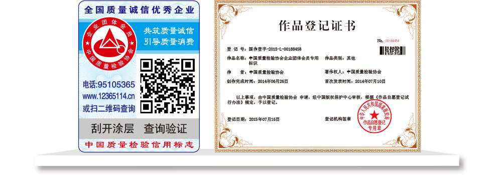 【“全國質(zhì)檢穩(wěn)定合格產(chǎn)品”專用標(biāo)識(shí)】具有專屬的知識(shí)產(chǎn)權(quán)(經(jīng)中國版權(quán)保護(hù)中心審核,國家版權(quán)局對“全國質(zhì)檢穩(wěn)定合格產(chǎn)品”專用標(biāo)識(shí)頒發(fā)了《作品登記證書》,登記號:國作登字-2015-L-00188456),基本規(guī)格為5cm2,集電話電碼防偽查詢、二維碼在線掃描、微信驗(yàn)證等多種功能于一體,綜合運(yùn)用了紐索幣紋、微縮文字、熒光激發(fā)油墨等多種防偽技術(shù);專用標(biāo)識(shí)加貼在產(chǎn)品或包裝上,消費(fèi)者只需要用座機(jī)(手機(jī))電話撥打全國范圍內(nèi)都不需要加區(qū)號的特服號碼95105365或使用手機(jī)掃描二維碼或登陸網(wǎng)站(http://www.12365114.cn)就可直接查詢驗(yàn)證加貼專用標(biāo)識(shí)的產(chǎn)品為中國質(zhì)量檢驗(yàn)協(xié)會(huì)調(diào)查匯總證明的全國質(zhì)量檢驗(yàn)穩(wěn)定合格產(chǎn)品,助力企業(yè)通過“質(zhì)量檢驗(yàn)”的比較優(yōu)勢去贏得消費(fèi)者更多的信任,形成企業(yè)自己獨(dú)有的比較優(yōu)勢。