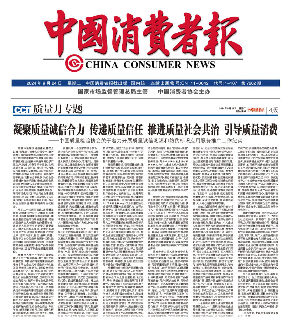 - 中國消費者報—凝聚質(zhì)量誠信合力 傳遞質(zhì)量信任 推進質(zhì)量社會共治 引導(dǎo)質(zhì)量消費——中國質(zhì)量檢驗協(xié)會關(guān)于著力開展質(zhì)量誠信溯源和防偽標(biāo)識應(yīng)用服務(wù)推廣工作紀實