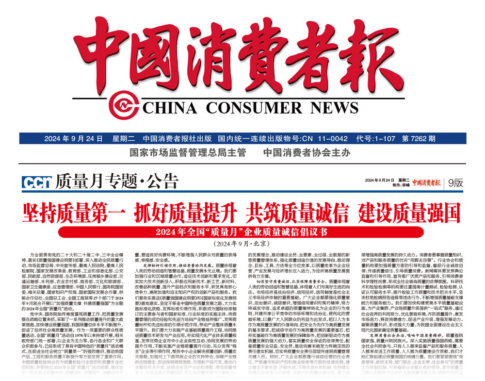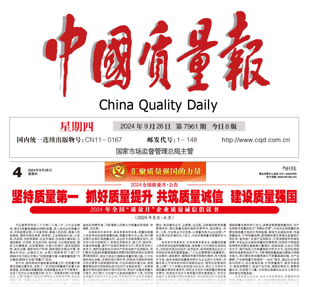 - 中國質(zhì)量報—堅持質(zhì)量第一抓好質(zhì)量提升 共筑質(zhì)量誠信 建設(shè)質(zhì)量強國——2024年全國“質(zhì)量月”企業(yè)質(zhì)量誠信倡議書(2024年9月·北京)
