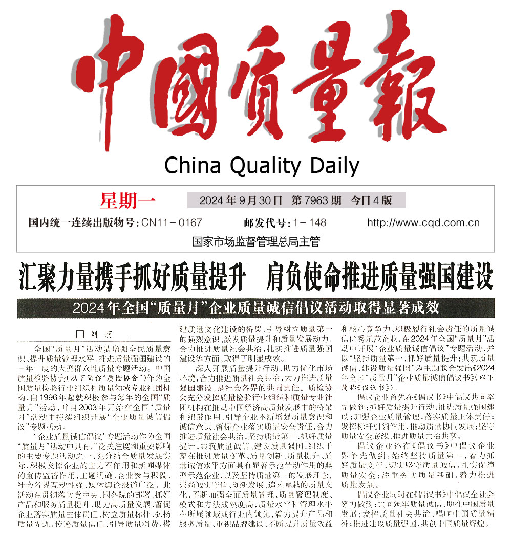 - 中國質(zhì)量報—匯聚力量攜手抓好質(zhì)量提升 肩負使命推進質(zhì)量強國建設(shè)——2024年全國“質(zhì)量月”企業(yè)質(zhì)量誠信倡議活動取得顯著成效